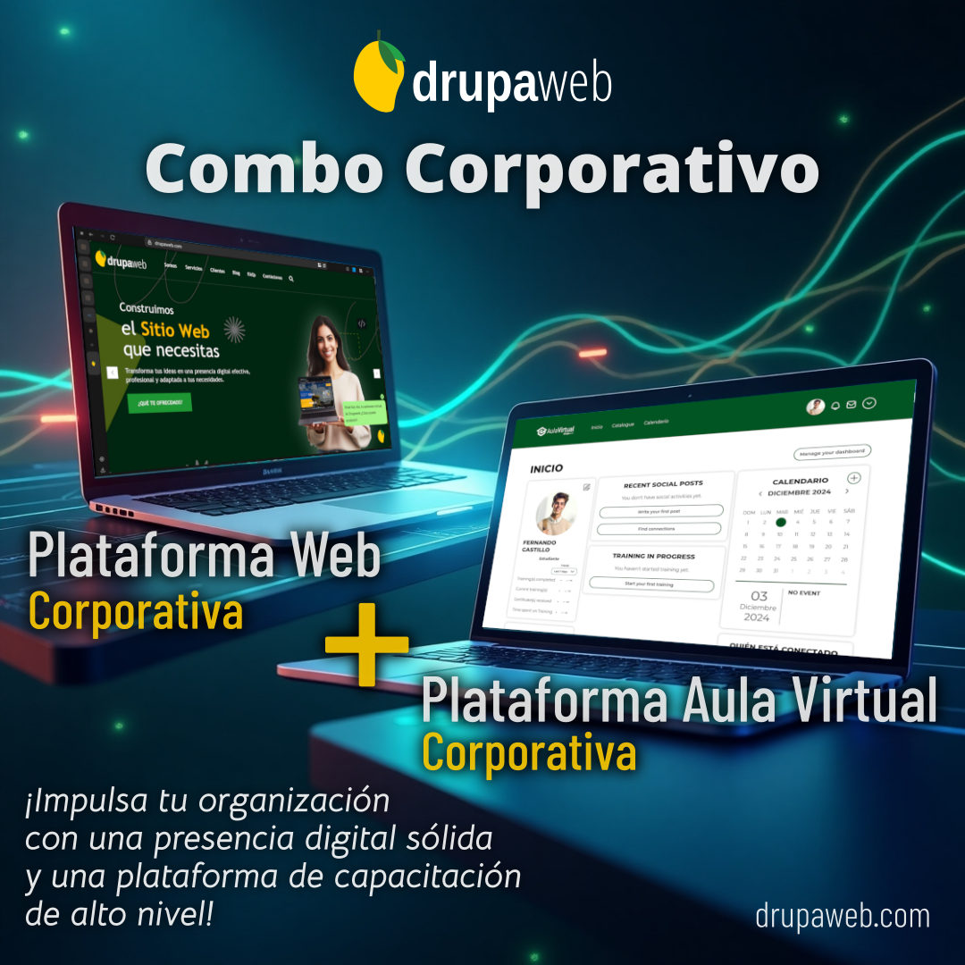 El Combo Corporativo de Drupaweb representa una inversión incomparable. Por un precio accesible y único, tu empresa u organización accede a dos plataformas profesionales que por separado podrían costarte más del doble. Regístrate aquí y conoce más sobre este Combo.